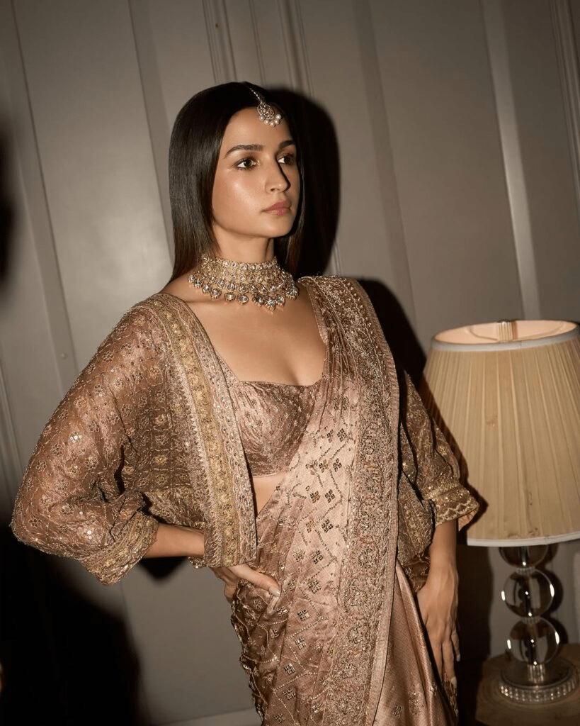 Alia Bhatt exudes classic charm in an archival Ritu Kumar silk saree and cape—an exquisite design dating back nearly three decades. Her look is elevated with the opulent brilliance of Birdhichand Ghanshyamdas Jewellers and a beautifully crafted Maang Tika by Sanzany Jewels, embodying a perfect balance of grace and nostalgia.