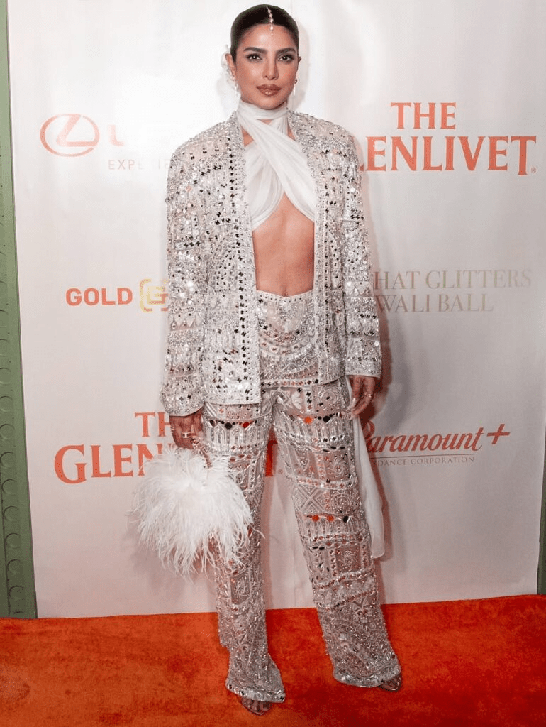From New York, Priyanka Chopra Jonas embraced understated glamour, pairing her metallic outfit with elegant silver and diamond creations from Bvlgari. A delicate maang tikka and diamond drops completed her sophisticated Diwali look—capturing the glow of love and light alongside Nick Jonas.