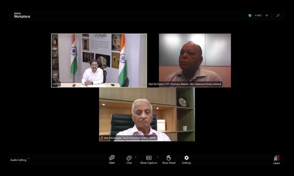 The webinar featured Mr. Nirakar Chand, CEO – Precious Metals, Diamond India Limited (DIL), as the keynote speaker, and was moderated by Mr. Sabyasachi Ray, Executive Director, GJEPC. Other distinguished attendees included Mr. Tariq Thomas, Director, Department of Commerce (DoC); Ms. Tuhina Das, Deputy Director, DoC; and Mr. K.K. Duggal, Senior Director – Policy, GJEPC.