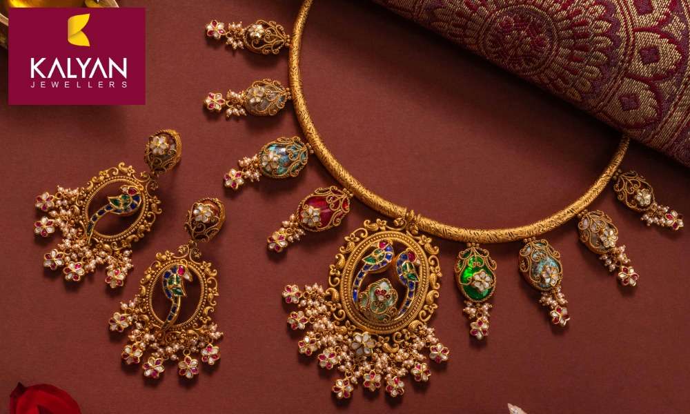 Mark the festivities with this antique gold set from Kalyan Jewellers, embellished with festive emerald greens, regal purples, and rich ruby reds reminiscent of playful gulal hues. Intricate gold craftsmanship is beautifully complemented by a serene teardrop turquoise centrepiece, adding dimension and grace. Ideal for festive occasions, it pairs elegantly with a classic white kurta or a pastel saree, allowing the vibrant colours to stand out.